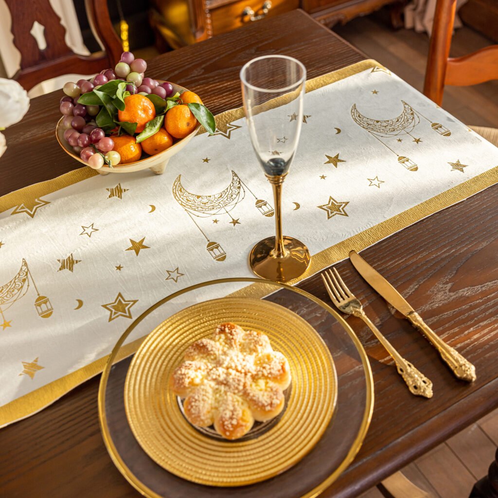 Chemin de table blanc et or motifs lune et etoiles