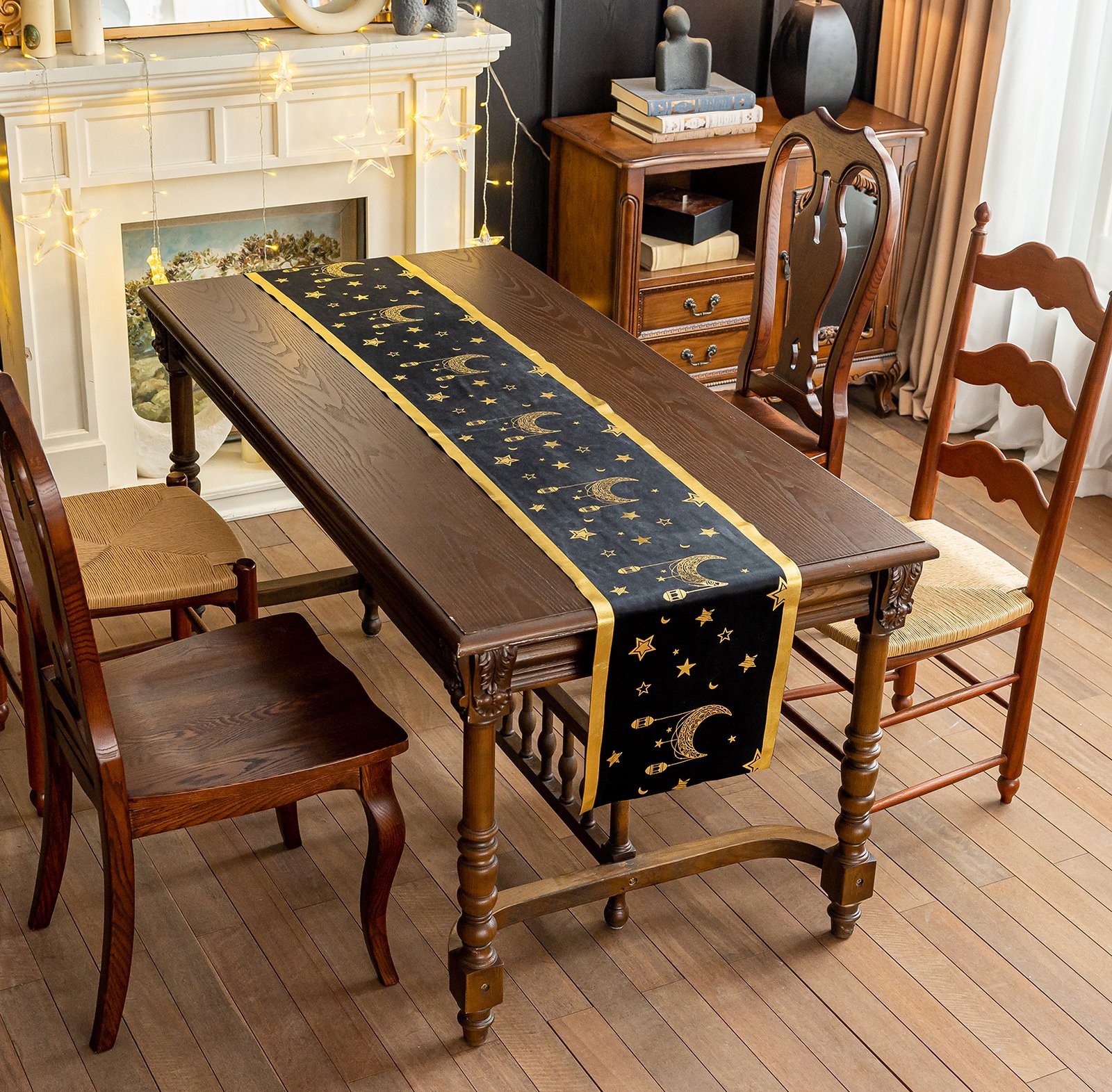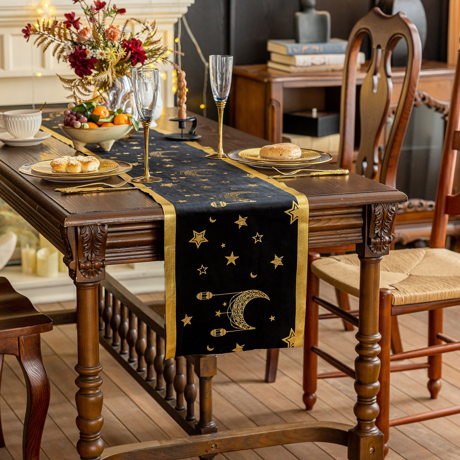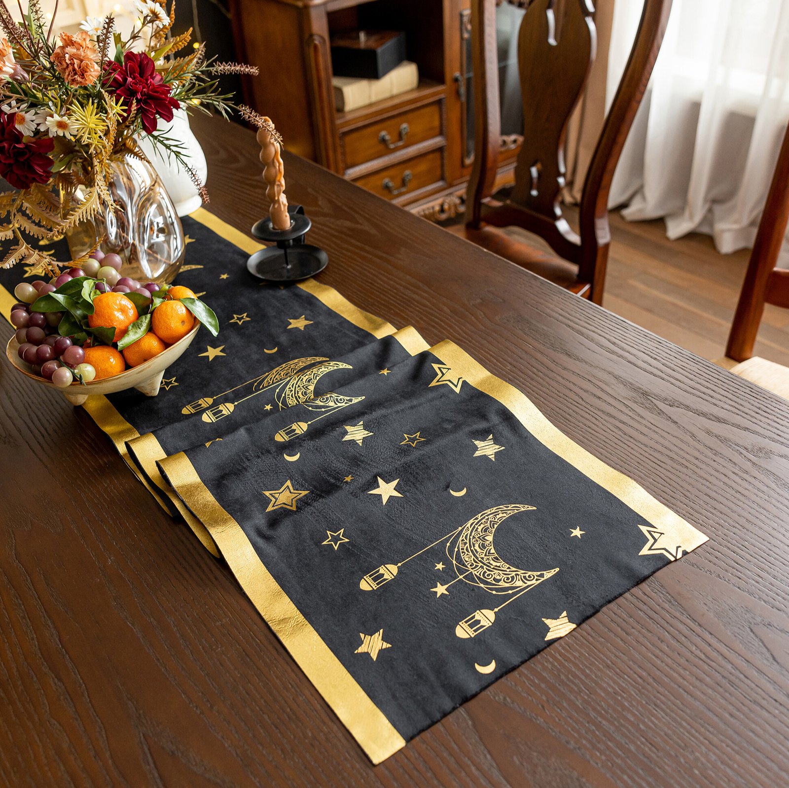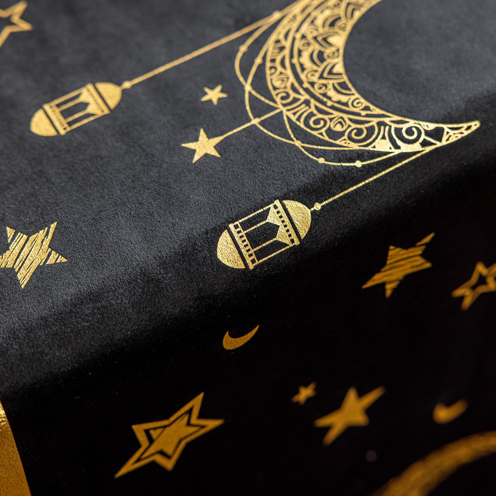 Sublimez votre décoration de table avec ce chemin de table Ramadan noir et doré aux motifs lune et étoiles, pensé pour instaurer une ambiance à la fois élégante, spirituelle et profondément chaleureuse. Il accompagne avec raffinement vos repas d’iftar et met en valeur chaque moment de partage durant le mois béni.