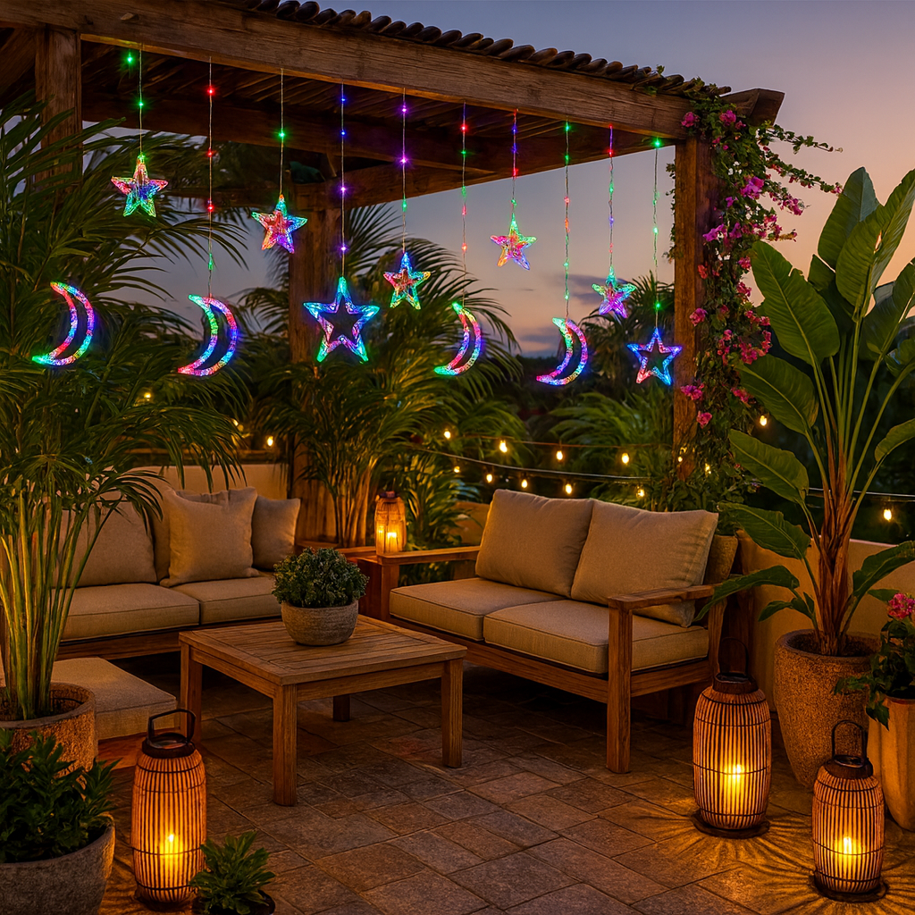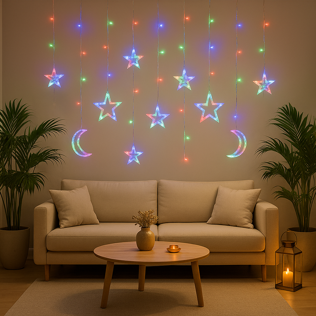 Notre Guirlande LED Lune et Étoile est l’accessoire parfait pour ajouter une dimension colorée et éco-responsable à votre décoration d’Eid.