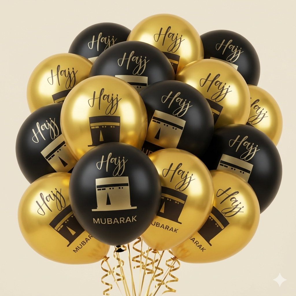 Ballons latex imprimés Hajj Mubarak 10 ballons latex : 5 noirs & 5 dorés, ornés du motif Kaaba et de l’inscription « Hajj Mubarak » en calligraphie dorée. Festifs et spirituels, ils apportent volume et hauteur à votre décoration.