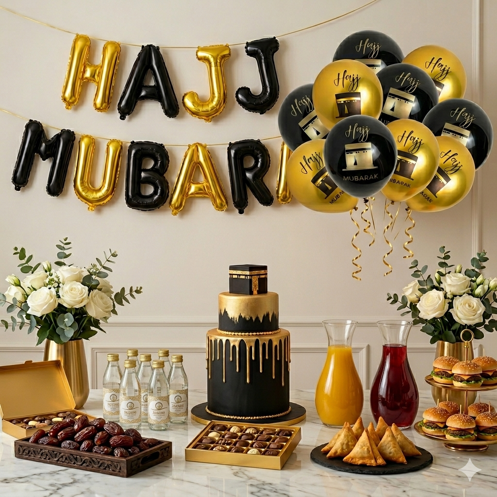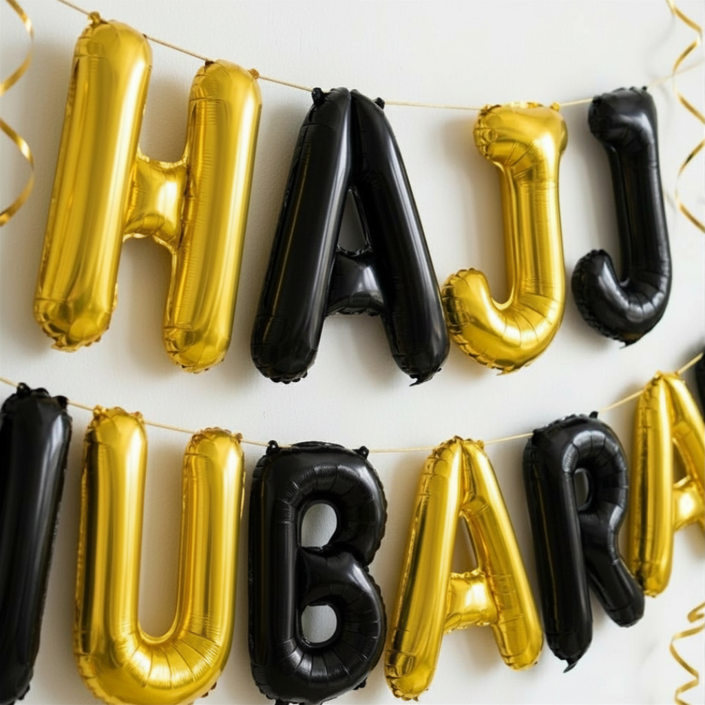 • Mur & table de fête : Suspendez les ballons lettres « HAJJ MUBARAK » au-dessus de votre table de fête ou buffet pour créer un point focal élégant. Disposez-y vos dattes, bougies et petites attentions pour un rendu digne d’un accueil 5 étoiles.