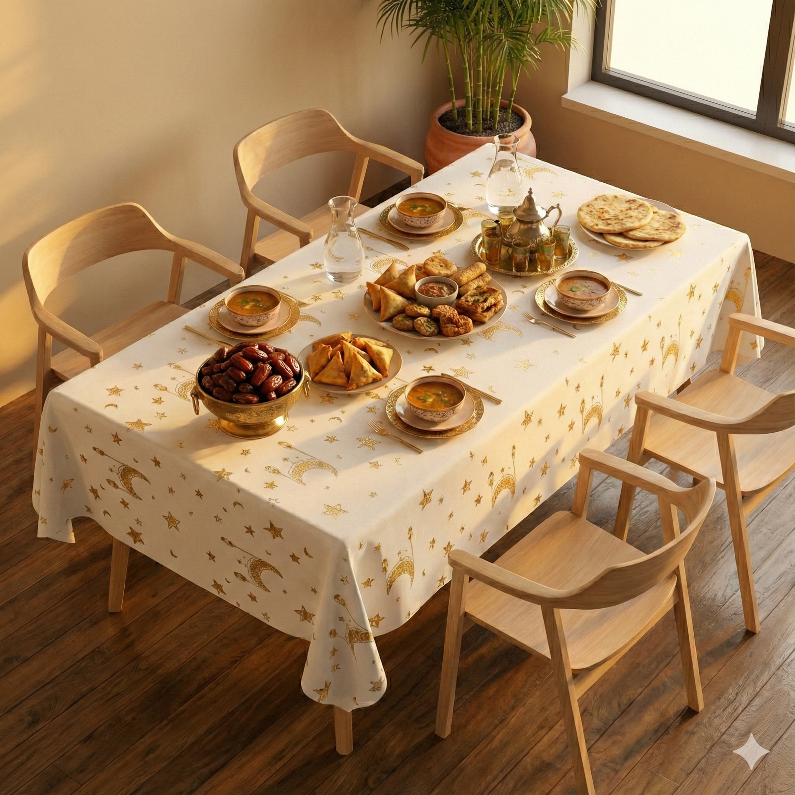 Cette nappe Ramadan blanche et dorée est idéale pour celles et ceux qui souhaitent combiner esthétique, tradition et modernité, et offrir à leur table un cadre harmonieux et inspirant pour célébrer le mois béni.