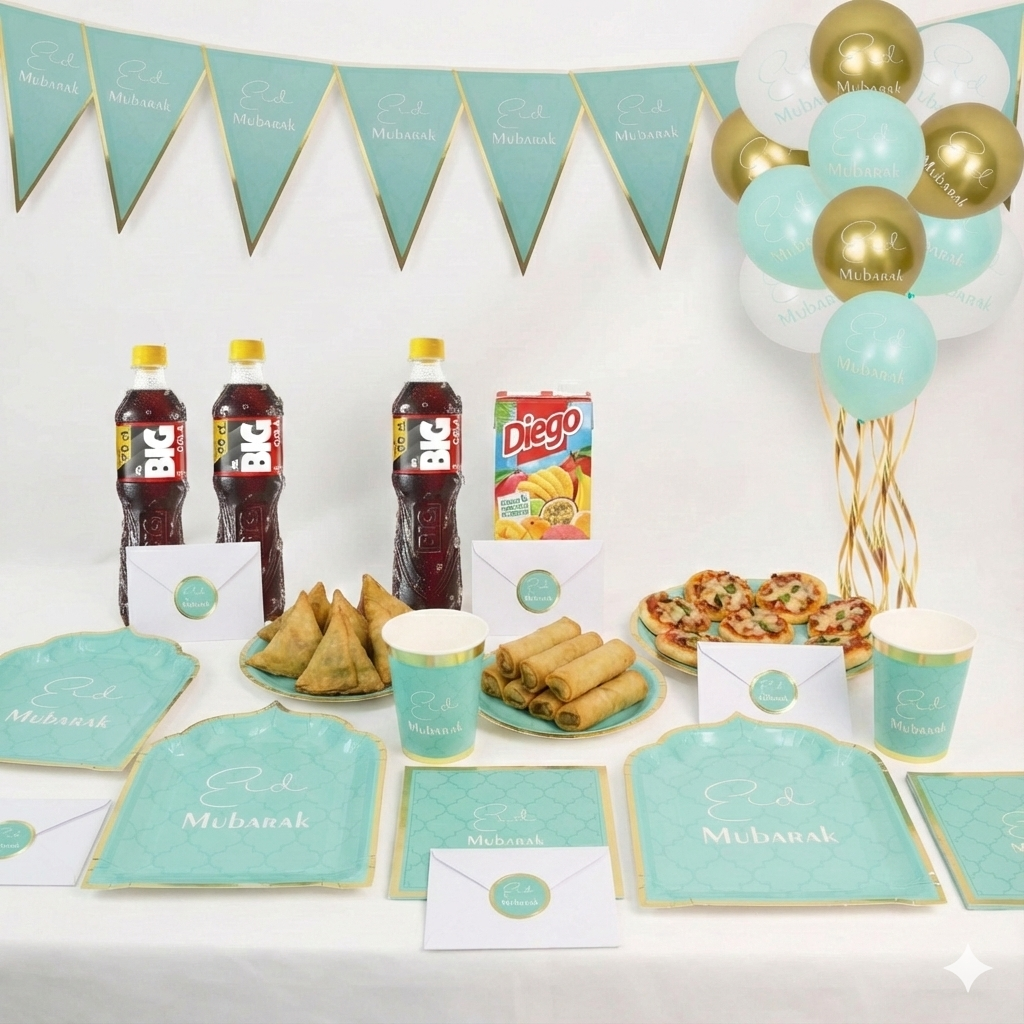Sublimez votre fête de l’Eid avec ce pack décoration bleu Tiffany et doré, une solution clé en main conçue pour créer une table à la fois moderne et profondément élégante.