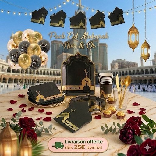 Sublimez votre fête avec une touche de prestige et de modernité grâce au Pack décoration Eid Mubarak Noir et Or.