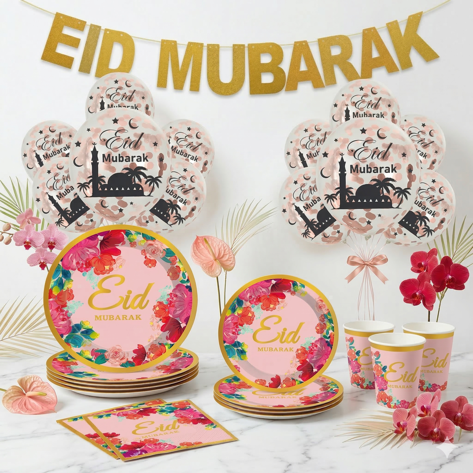 Pour un rendu d’exception, associez ce pack avec nos Ballons Eid Mubarak – Rose gold. Ils s’accordent parfaitement avec les nuances de fleurs du pack Foulera.